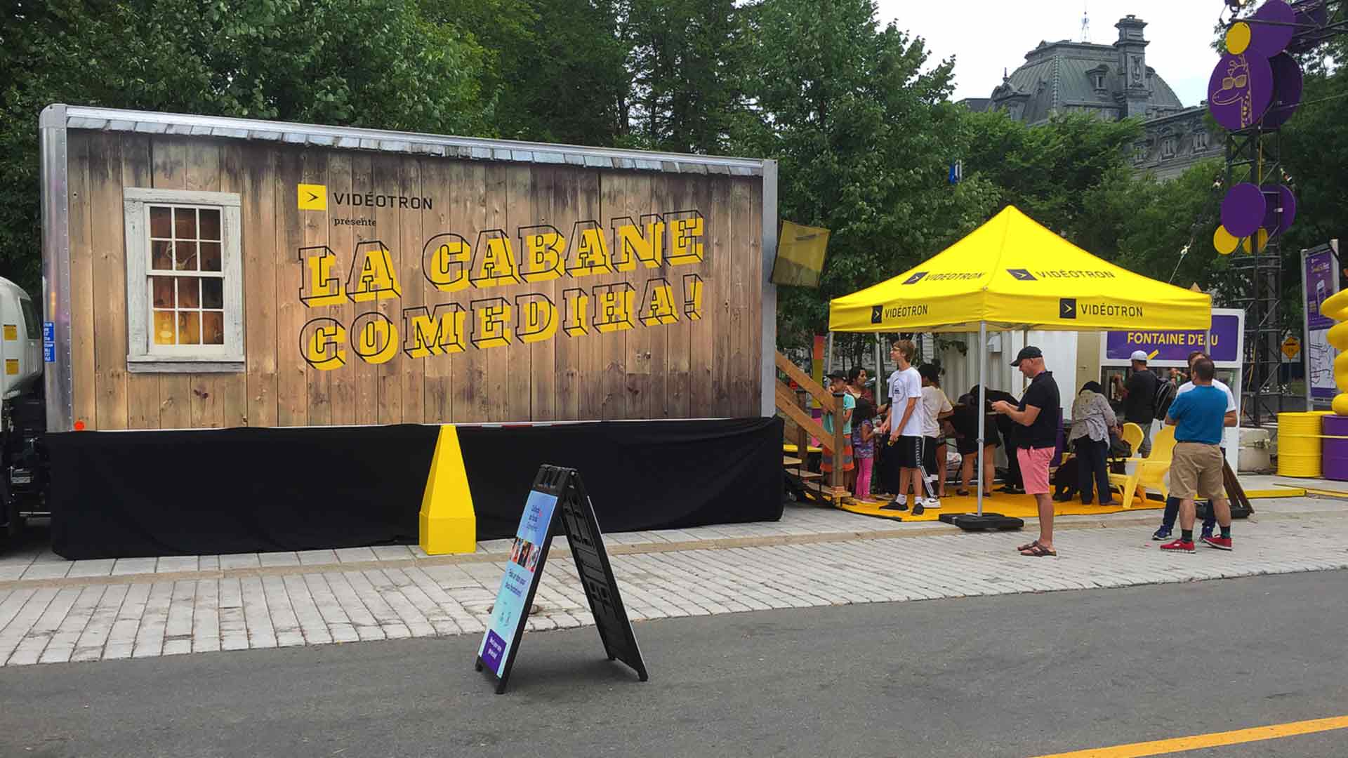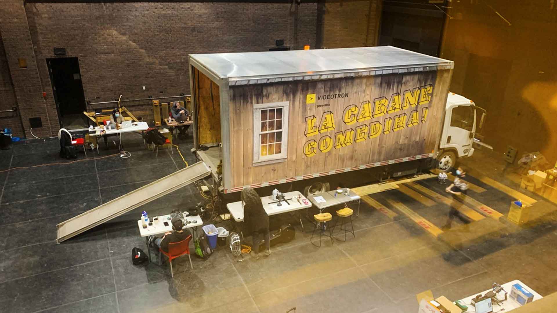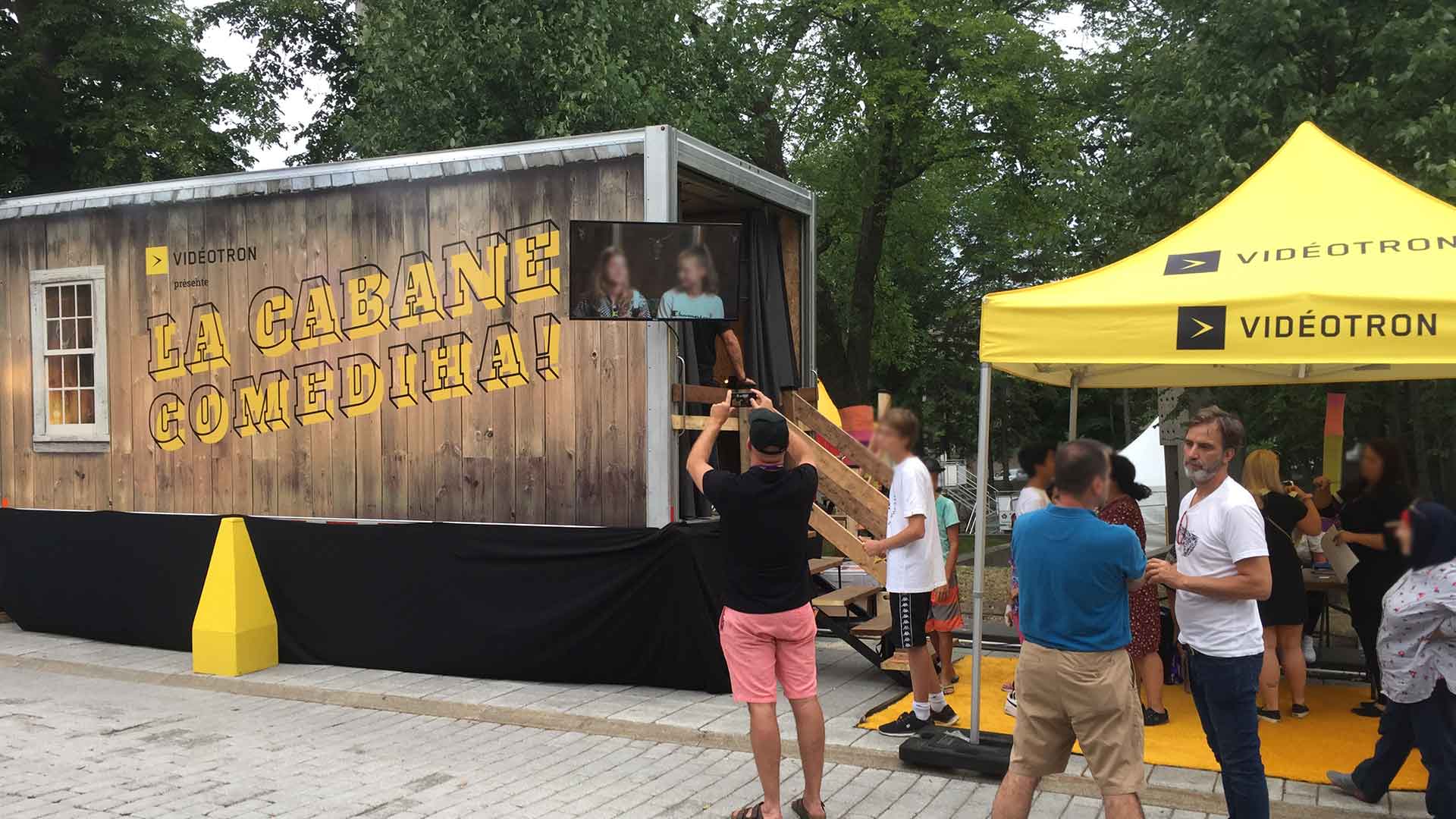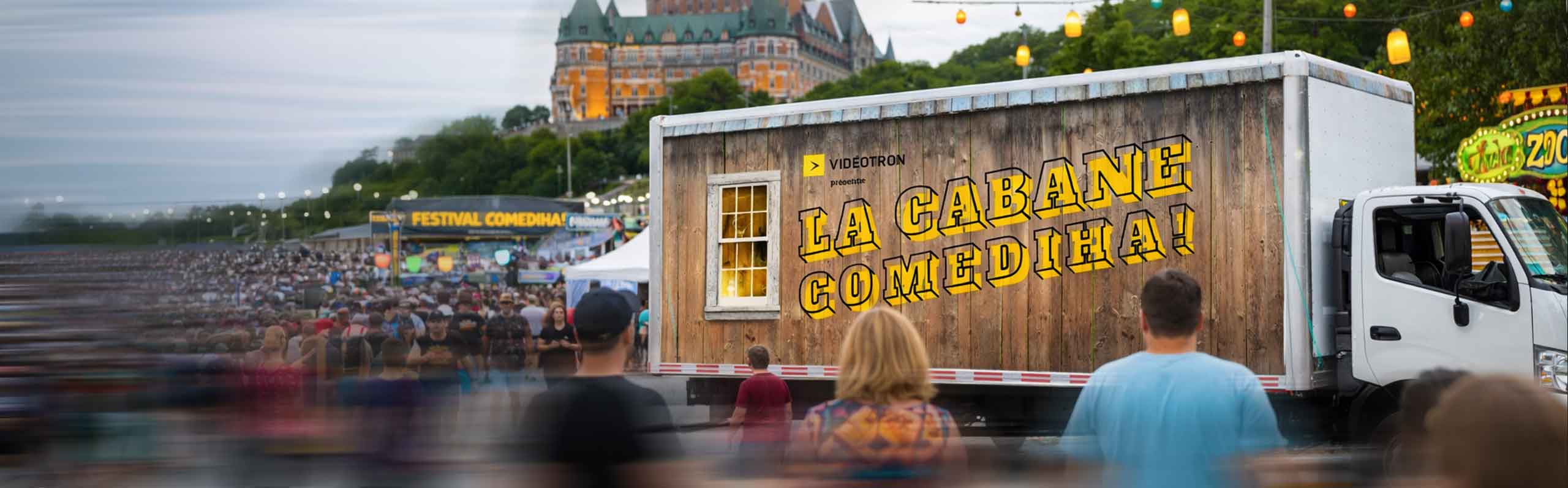 Développée spécifiquement pour le Festival ComédiHa! à Québec, La Cabane est un camion cube transformé en studio de tournage mobile entièrement équipé, doté d’un dispositif de captation multi-caméras.